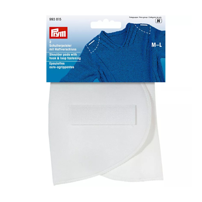 The crescent shaped shoulder pads are particularly suitable for modelling and highlighting the shoulders in inset sleeves of knitwear, jackets and blazers. They make a slim waist, create a feminine silhouette and thereby emphasize the ideal female proportions. With their hook tape they adhere reliably on all fluffy clothes. For additional hold the loop tape included can be sewn into the clothing. The shoulder pads are covered with 100% polyester and remain completely dimensionally stable with gentle care in the washing machine. In the Prym range two shoulder pads on a card are available. Available in three colours and two different sizes.